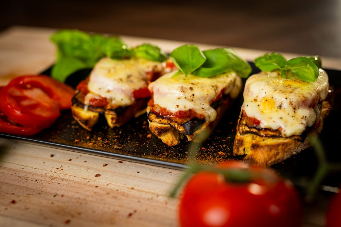 Na fotografiji so prikazani obloženi kruhki s pečenim jajčevcem, paradižnikom in mocarelo. Rezine jajčevca spečemo do mehkega, jih obložimo s paradižnikom in mocarelo ter na kratko zapečemo, da se sir stopi. Postrežemo na popečenem kruhu, po želji z dodatkom sveže bazilike in kapljico olja.